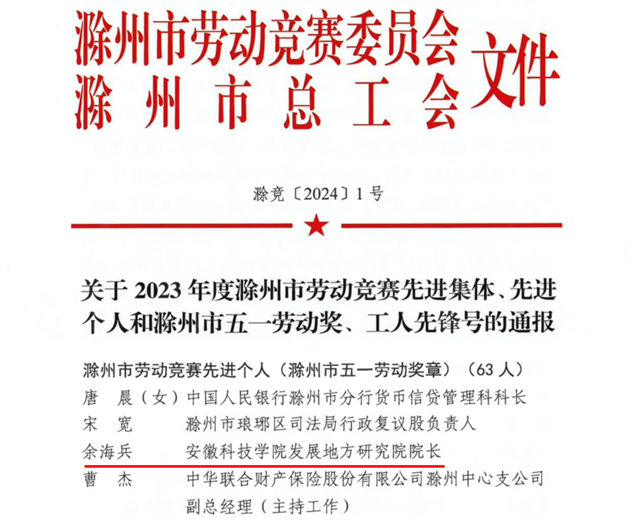 4月29日,滁州市劳动竞赛委员会、滁州市总工会公布了2023年度“滁州市五一劳动奖章”获得者名单,经南谯区科创城提名推荐,威尼斯官网农学院教师余海兵教授获此殊荣。