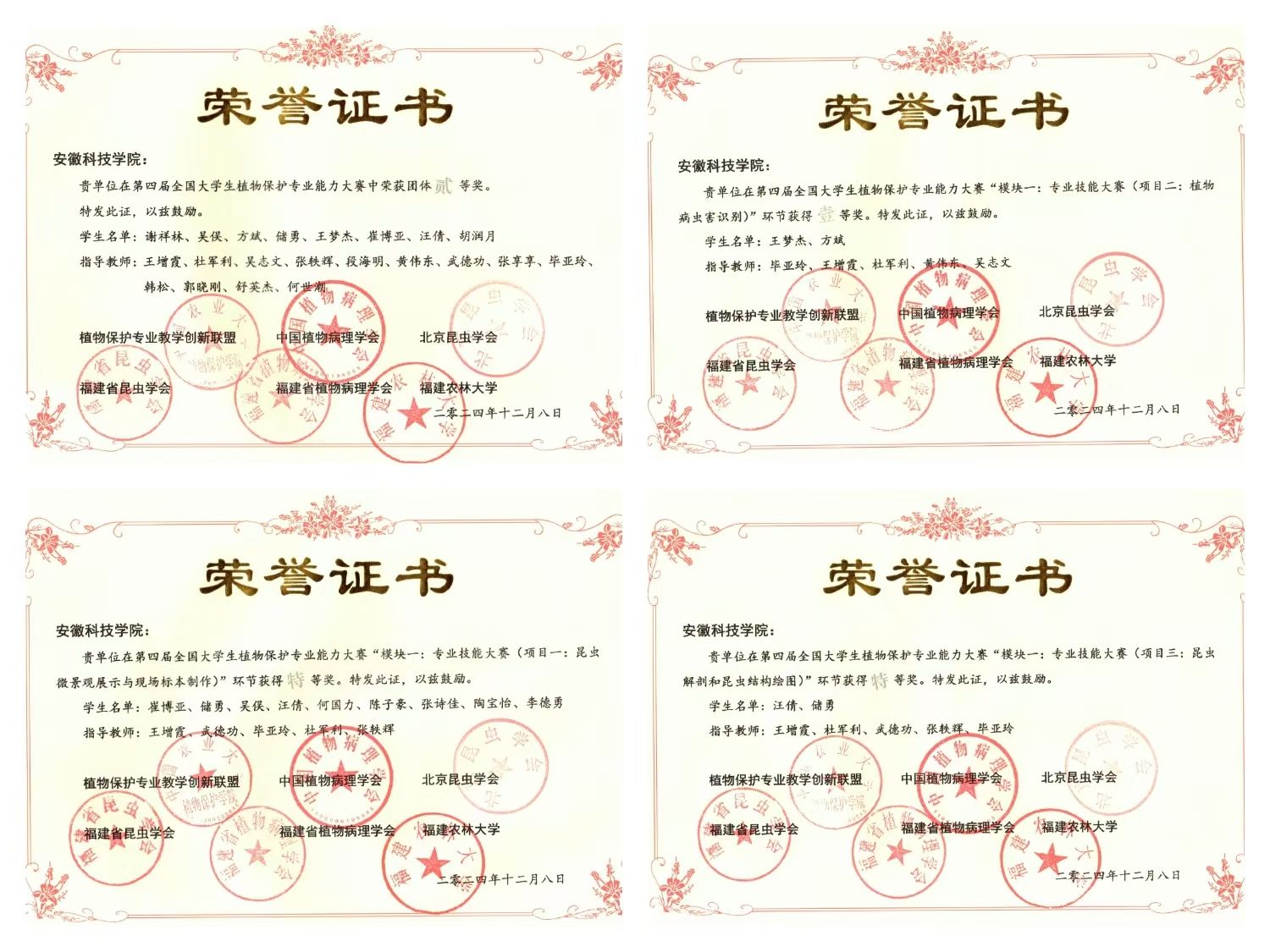 其中,汪倩同学的“昆虫解剖和昆虫结构绘图”项目以全国第一名的成绩获得特等奖,崔博亚和储勇等同学获得“昆虫微景观展示与现场标本制作”项目特等奖。王梦杰和方斌同学获得“植物病虫害识别”项目一等奖,胡润月获得“植物病理学实验操作和病原物结构绘图”项目二等奖,范晶晶和崔博亚获得“植物保护专业知识视频制作与展示”项目二等奖。方斌和谢祥林获得“创新创业优秀项目展示”三等奖,谢祥林和吴俣在“本科生学术交流报告”项目中获得三等奖。青年教师吴志文在“青年教师学术论坛”项目中获得三等奖。威尼斯官网代表队最终荣获团体二等奖。
