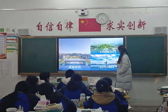 回到母校后,团队成员看望了高中班主任和任课老师,向他们汇报了自己在安科的收获和成长业绩。之后在班主任的带领下,团队们来到高三部分班级开展宣讲,结合PPT介绍了安科的历史底蕴,发展前景和学科专业,以及实验设备和实验环境等,并向学弟学妹们分享了在大学里遇到的挑战和机遇,并鼓励他们要勇敢面对,追求自己的梦想,努力提高自己的综合素质,为未来的大学生活打下坚实的基础。